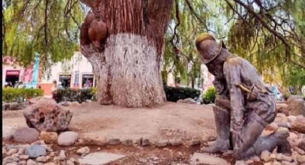 Al pie del árbol se encuentra una escultura de Hernán Cortés, el cual se mantiene arrodillado llorando su derrota.