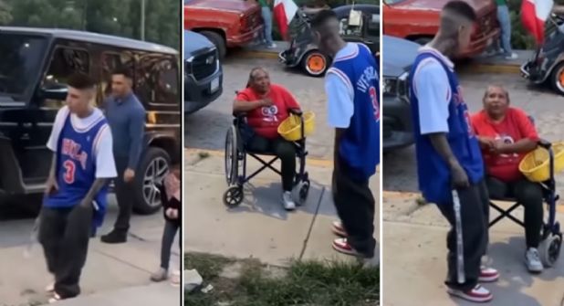 En el video, que se ha viralizado en Instagram, Facebook y X (Antes Twitter), se puede apreciar que el famoso rapero guanajuatense se baja de una camioneta negra y se dirige directamente hacia una mujer que se encontraba en silla de ruedas, a quien le falta una parte de su pierna derecha y tiene un pequeño canasto con dulces de los que vende para ganarse la vida.