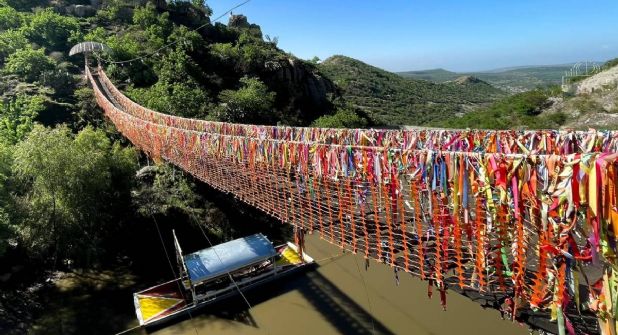 Pero lo más llamativo para los turistas es su puente colgante, que parece sacado de un cuento de hadas por los cientos de listones de colores que tiene atados entre sus cuerdas.