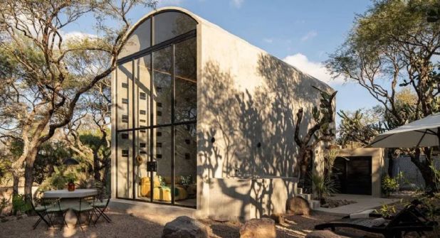 Esta peculiar cabaña en San Miguel de Allende es una bóveda de altura doble que está construida con concreto y cemento, está adornada con un gran ventanal de fierro que permite ver la entrada de la luz solar por las mañanas y admirar la luna y las estrellas en las noches.