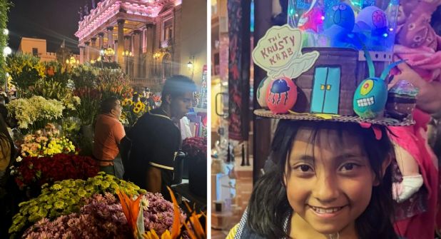 Entre las canastas de flores, los cascarones decorados rellenos de confeti y los rehiletes, llamaron la atención unos sombreros del Crustáceo Cascarudo, con luces, sonido, y por supuesto los personajes de Bob Esponja representados con cascarones decorados: Don Cangrejo, Calamardo, Gary, Plankton y hasta medusas.