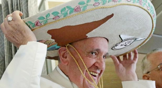 El Papa Francisco llegó a México la noche del 12 de febrero del 2016, y durante su trayecto en el avión fue fotografiado portando el sombrero con una gran sonrisa. Su visita, con fines de trabajo, abarcó los estados de CDMX, Chiapas, Michoacán y Chihuahua.