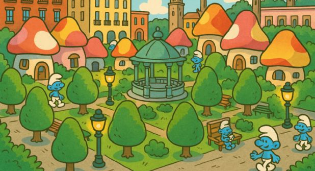 La comparación no es sólo visual: hay una atmósfera similar. Así como en la aldea pitufo la comunidad se organiza en torno a una pequeña plaza, con senderos naturales y un ambiente alegre, en la plaza leonesa todo gira alrededor del kiosco central. Desde ahí parten caminos de cantera que dividen en secciones a los árboles cuidadosamente podados, mientras los visitantes pasean, se sientan a leer o conversan entre sombras redondeadas que parecen sacadas de una película infantil.