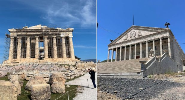 Aunque no tiene las 8 columnas al frente del templo griego, sino 12, la fachada es muy semejante, según se puede apreciar en la foto principal de esta nota informativa.