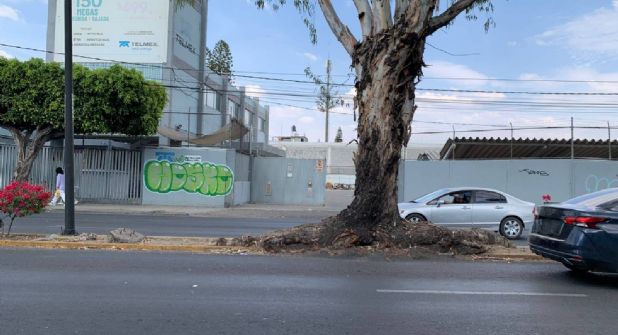 León-. El árbol se encuentra en uno de los camellones del bulevar Mariano Escobedo, justo enfrente del Panteón San Nicolás, sus raíces han crecido tanto que ya superaron la zona en donde creció pues ya invaden los carriles de los automóviles.