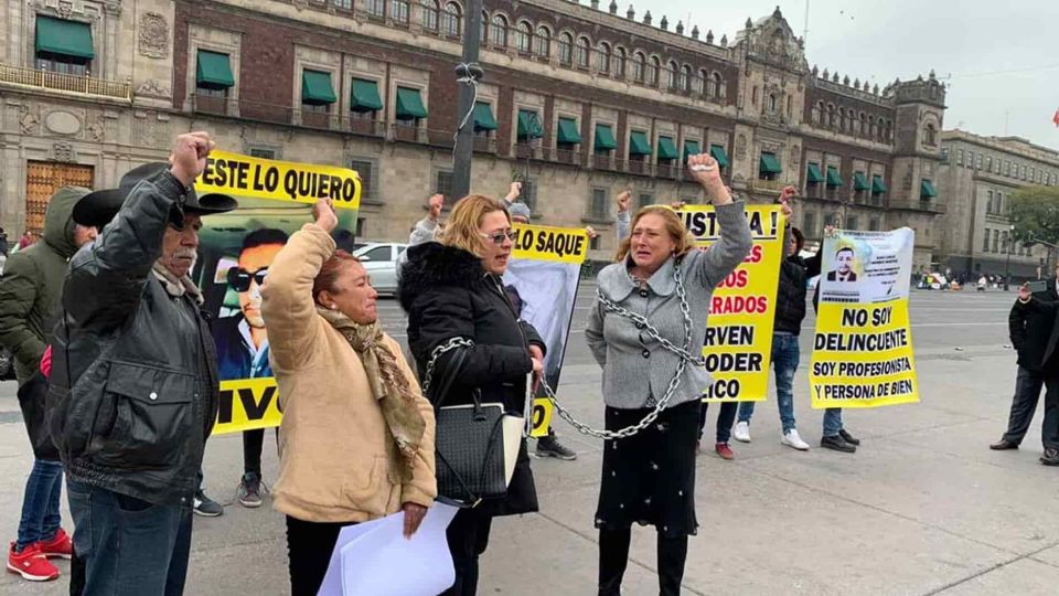 Por lo cual un grupo de personas con cadenas enredadas en el cuerpo y lonas se manifestaron frente al Palacio Nacional para solicitar al Presidente de la República, Andrés Manuel López Obrador, los recibiera para exigir que “se garantice un juicio justo”.