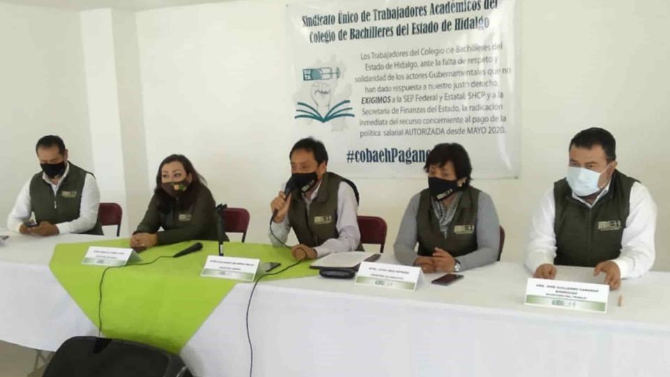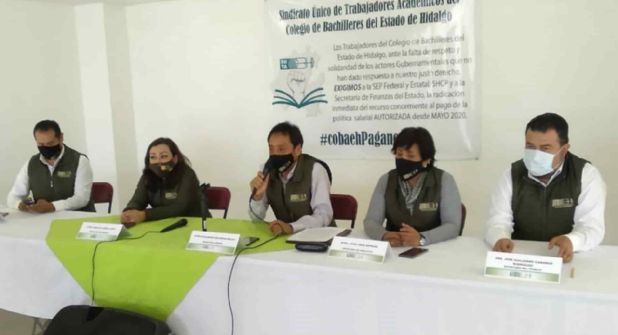 PACHUCA.- Trabajadores del Sindicato del Colegio de Bachilleres del Estado de Hidalgo (SUTACOBAEH) denunció el incumplimiento del pago del incremento salarial autorizado para el presente año, en conferencia de prensa por parte del Comité Ejecutivo, a nombre del secretario general Alejandro Mejorada Mejay.