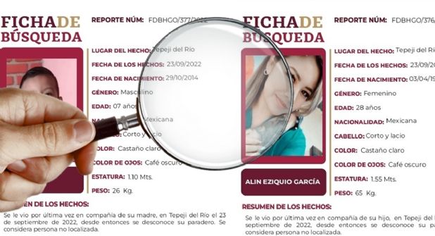 La Procuraduría General de Justicia en el Estado Hidalgo (PGJEH) emitió las fichas de búsqueda correspondientes para localizar a estas dos personas con reporte de desaparecidos desde el 23 de septiembre de 2022.
