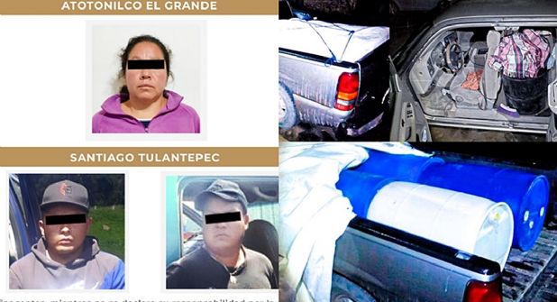 Finalmente, entre tierras de cultivo, en el lugar conocido como San Miguelito, en Tlaxcoapan, fue localizada una camioneta que cargaba dos contenedores con capacidad para mil litros cada uno, abastecidos al 40 y 35 por ciento, respectivamente, por lo que fue asegurada.