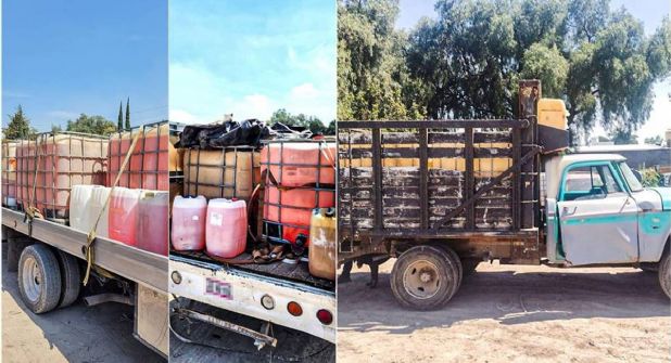 Por otro lado, en la localidad Teocalco, municipio Tula, agentes estatales localizaron una camioneta Dodge, de redilas, con placas de Hidalgo, cargada con cuatro contenedores para mil litros, tres de estos vacíos y uno más abastecido en un tercio de su capacidad, con líquido con las características de hidrocarburo.