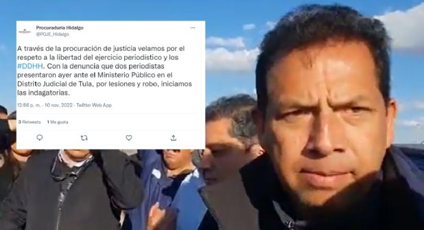“A través de la procuración de justicia velamos por el respeto a la libertad del ejercicio periodístico y los #DDHH. Con la denuncia que dos periodistas presentaron ayer ante el Ministerio Público en el Distrito Judicial de Tula, por lesiones y robo, iniciamos las indagatorias.