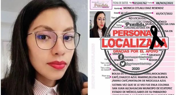 PACHUCA.- Luego de casi ocho días de intensa búsqueda, la tarde de este miércoles 9 de noviembre de 2022 finalmente fue localizada Mónica Citlalli Díaz Reséndiz, quien el 3 de noviembre salió de su vivienda hacia su trabajo en una escuela de inglés sobre la Vía Morelos en Ecatepec, Estado de México.