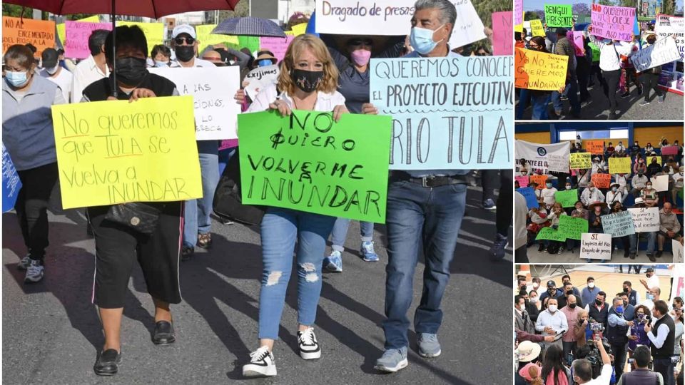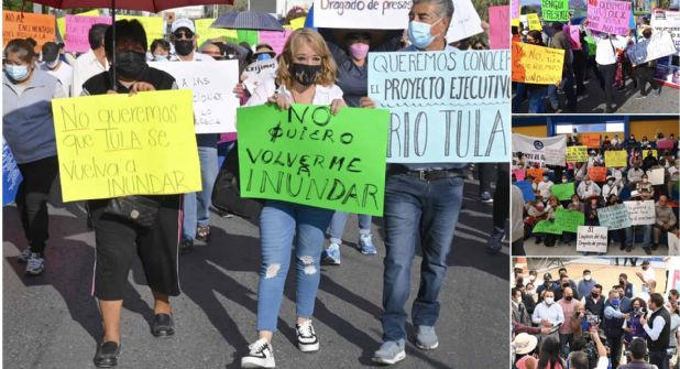 TULA DE ALLENDE.- En lo que se suponía el inicio de obras de revestimiento con concreto hidráulico al río Tula que se desbordó en septiembre de 2021, habitantes de Tula de Allende realizaron una marcha y protesta.