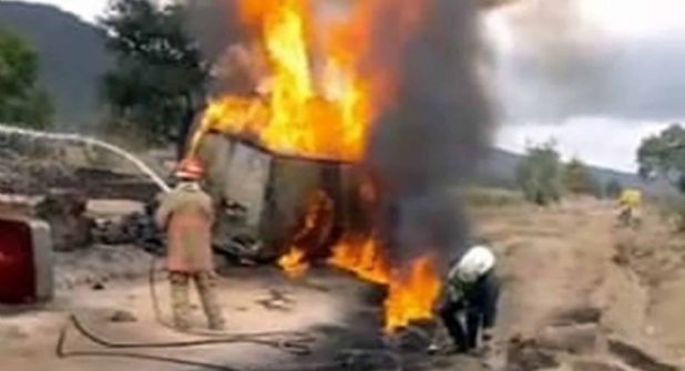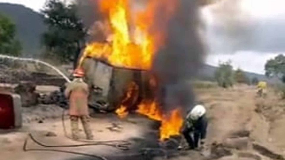 Presuntamente la unidad, tipo Van, transportaba huachicol, lo que habría originado las llamas cuando transitaba por un camino de terracería.