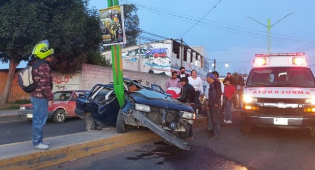 La frágil unidad detuvo su marcha contra un poste de alumbrado público e impactó en el costado derecho; por la fuerza, el vehículo se dobló.