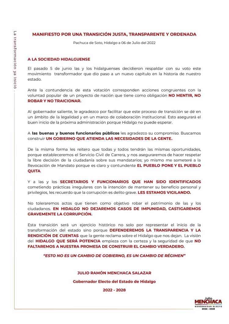 “Esto asegurará el buen inicio de la próxima administración porque Hidalgo no puede esperar”, asentó el mandatario electo en su manifiesto en redes sociales y calificó que será un ejercicio histórico.
