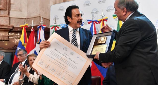 PACHUCA.- En el Salón Azul de la Cámara de Senadores de Argentina, el mandatario de Hidalgo Omar Fayad Meneses recibió la distinción Líderes para el Desarrollo: “Gobernador Enrique Tomás Cresto” por su política educativa, en particular por la implementación del Sistema Integral de Educación Media Superior (Sidems), modelo pedagógico único en México.