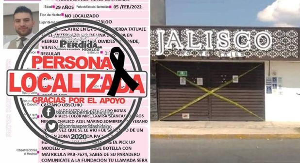 El 15 de febrero de 2022, la asociación civil Sonrisas Perdidas emitió la ficha de búsqueda de Josué Daniel Reyes Contreras, de 29 años de edad, quien fue visto por última vez el 5 del mismo mes en el bar Jalisco No Te Rajes, ubicado en Zona Plateada, Pachuca.