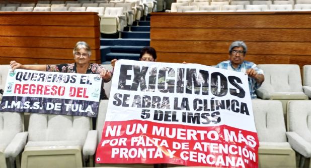 “Venimos a expresar que no tenemos servicio médico desde que se inundó el Seguro Social de Tula; a partir de eso, para dar servicio médico se está utilizando una casa donde tienen cinco consultorios y no hay servicio de emergencia, por lo tanto, la gente que va con infartos o con una gravedad no son atendidos y se llegan a morir. Entonces, esa es la principal, preocupación que tenemos”, expresó.