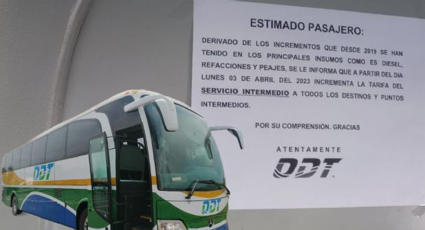 “Derivado de los incrementos que desde 2019 se han tenido en los principales insumos como diésel, refacciones y peajes, se le informa que a partir del día lunes 3 de abril del 2023 incrementa la tarifa del transporte de servicio intermedio a todos los destinos y puntos”, se informa a través de circulares que fueron colocadas en las unidades.