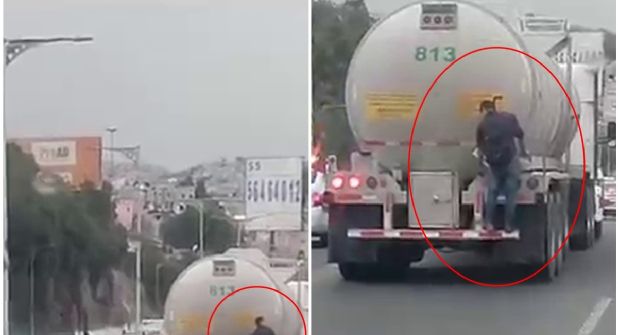 PACHUCA.- Antes muerto que llegar tarde y perder el bono de puntualidad, es la famosa frase que se dice cuando personas son captadas viajando a toda velocidad y de forma aventurada, sin embargo, recientemente un joven trasladó el dicho a la vida real al exponer su vida para llegar de un punto a otro y lo hizo sobre el remolque de pipa de un tráiler que circulaba por la autopista México-Tuxpan y su hazaña quedó grabada en video que ya es viral por lo impactante.
