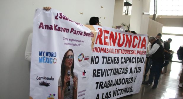 "No tiene capacidad, revictimiza a tus trabajadores y a las víctimas. Renuncia: no más violentadores al poder", dice una de estas lonas.