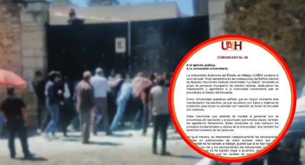 PACHUCA.- Al menos tras nueve horas de que se suscitaran dos actos de enfrentamiento en edificios de la Universidad Autónoma del Estado de Hidalgo (UAEH) con alumnado inconforme, fue emitida una postura de manera oficial que narró lo ocurrido y en la que destaca que se asentó un desprestigio hacia la causa que le demandan estudiantes del Instituto de Artes (IA), que además de catalogarla como violenta, condenó totalmente los hechos de este lunes 19 de septiembre.