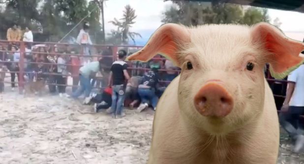 Todo era fiesta y alegría hasta que soltaron al puerco encebado y los participantes se lanzaron contra el animal con todo. Le hicieron bolita más de 7 hombres aferrados al lechón y ninguno cedía. Pocos minutos después los ánimos se calentaron y comenzaron las agresiones entre los participantes que desató la batalla campal.