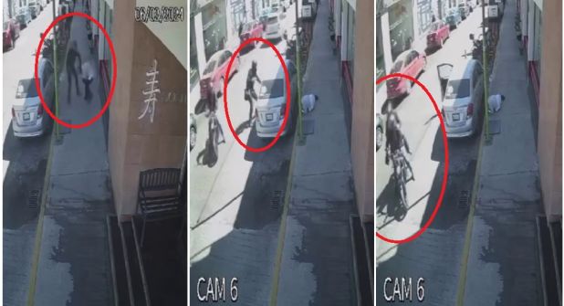Toda la situación de pánico que vivió la víctima fue captada por una cámara de vigilancia localizada entre las calles Hidalgo y Bicentenario de Tulancingo y la narrativa del video comenzó con que frente a un establecimiento una pareja de personas estacionó su automóvil tipo sedán gris a la orilla.