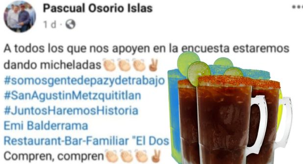 SAN AGUSTÍN METZQUITITLÁN.- Con el fin de poder obtener votos, los candidatos hacen peculiares actividades y acciones que los sobresalgan de entre el resto de competidores y un candidato del Movimiento Regeneración Nacional (Morena) en el estado de Hidalgo no es la excepción al prometer micheladas de regalo a quien lo apoye. Un tema controversial que ha divido opiniones.
