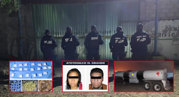 Simultáneamente, en el municipio Atotonilco El Grande, agentes estatales lograron la detención de un hombre y una mujer identificados con las iniciales R. G. B., alias El Pecas; y D. A. S. N., a quienes se les aseguraron 1,667 dosis de hierba seca con características de marihuana, 210 dosis de droga sintética “cristal”, dinero en efectivo, equipo de radiocomunicación y tecnológico.