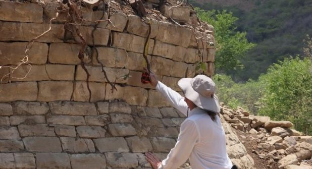 En la zona se identificó que el basamento tiene 3.5 metros de altura con una escalinata conservada, restos de un aplanado de barro y evidencias de que se trata, en realidad, de la subestructura de una construcción mayor, la cual habría alcanzado 15 metros de diámetro en su base, además de un juego de pelota de aproximadamente 18 metros de largo que permanece cubierto por vegetación.