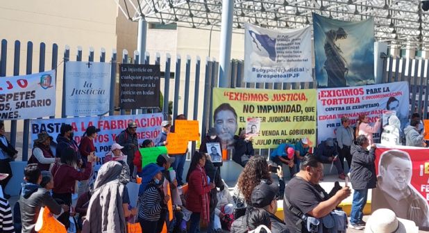 Pachuca.— Seguidores del expresidente municipal de Progreso, Armando Mera Olguín, y del exdiputado local, Edgar Hernández Dañu, provenientes del Valle del Mezquital, se manifestaron en la explanada del Poder Judicial de la Federación (PJF) en Pachuca, para exigir que las demandas de amparo que han promovido, sean resueltas a favor de ambos personajes que son residentes del Centro de Reinserción Social (Cereso) de Pachuca y en contra de quienes aseguran hay una repetida violación a sus derechos humanos.