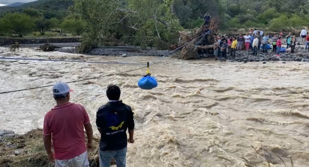 SAN AGUSTÍN METZQUITITLÁN.- En redes sociales circulan foto y videos en donde se observa cómo los pobladores se han valido de una tirolesa improvisada para hacer llegar los víveres de un extremo a otro para poder apoyar a las familias del barrio La Cañada, que quedaron incomunicadas por la creciente del río y los deslaves que obstruyen las carreteras en el municipio hidalguense San Agustín Metzquititlán.