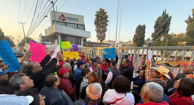 Tula.— La mañana de este viernes, derechohabientes, jubilados y familiares con pancartas y consignas se manifestaron frente al Hospital General de Pemex, ubicado en la Unidad Habitacional Pemex, en Tula de Allende, para denunciar una serie de irregularidades que, aseguran, ponen en riesgo la salud y la vida de los pacientes.