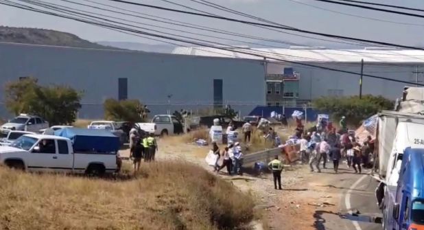 Pachuca.- Para lamentar. Este lunes 17 de noviembre, una vez más, pobladores protagonizaron un acto de rapiña tras un accidente carretero donde un tráiler volcó. Al instante, decenas de personas se acercaron para saquear el cargamento y llevarse el producto tirado sobre el distribuidor vial de la carretera federal 45 Palmillas-Huichapan, en la autopista México-Querétaro.