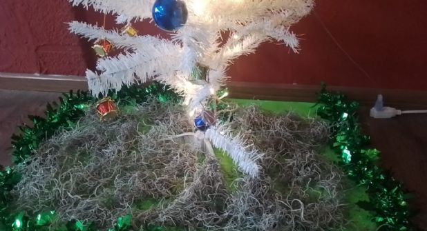 El heno se esparce en los pinos junto a decoraciones como esferas y luces, dando una atmósfera natural; mientras que el musgo se coloca en el suelo para poner las figuras del nacimiento que recrean el peregrinar de José y María; pero igual se suelen extraer piñas, plantas y hasta ramas de árboles.