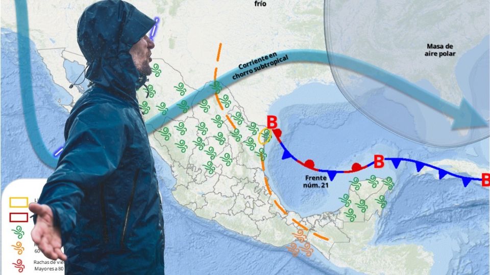 El frente frío se extenderá con características de estacionario sobre el noroeste, centro y oriente del golfo de México, manteniendo la probabilidad de chubascos y lluvias fuertes en algunas regiones. Al final del día se espera que dicho sistema frontal se desplace hacia el norte del golfo y deje de afectar al país.