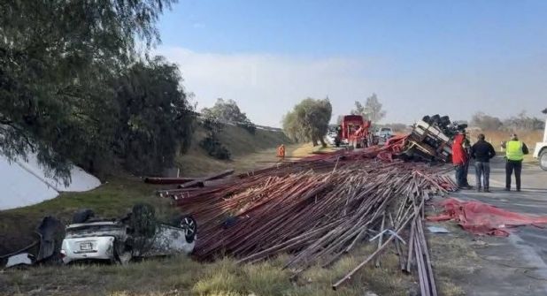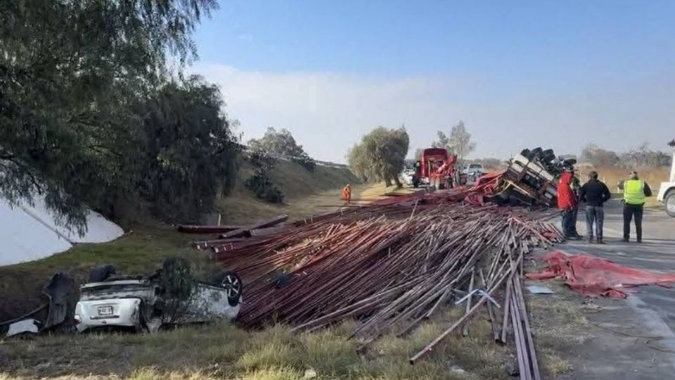 Pachuca.- Fuerte accidente se registró la mañana de este lunes 22 de diciembre sobre la autopista México-Pachuca a la altura de Zumpango, Estado de México, con dirección a la Ciudad de México. Un tráiler cargado con estructuras metálicas volcó sobre la vialidad e impactó contra otro vehículo particular orillándolo a salir bruscamente del camino.