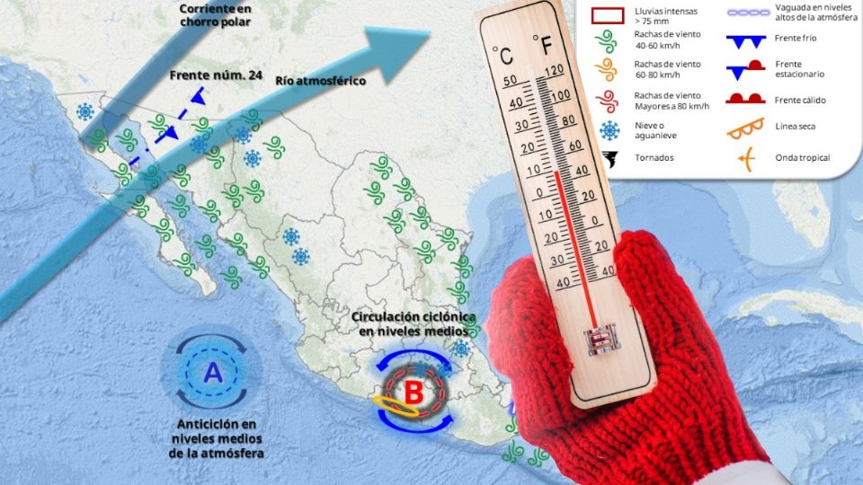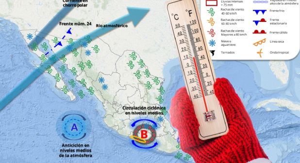 Pachuca.- Este sábado 27 de diciembre, el desplazamiento del frente frío número 24, una vaguada polar y el flujo de humedad del río atmosférico, mantendrán bajas temperaturas, fuertes rachas de viento, así como lluvias y chubascos en algunas regiones del país, de acuerdo con el Servicio Meteorológico Nacional de la Comisión Nacional del Agua (Conagua).