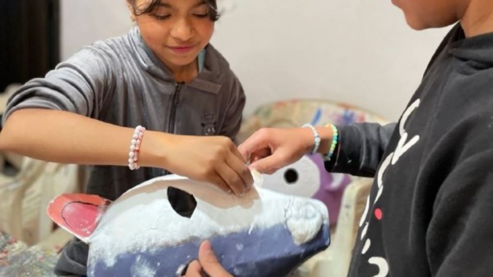 Ángeles, una de las niñas que asiste con regularidad a Rä Hmüda, se acomoda en una esquina, ha estado trabajando en un animal fantástico mitad perro, mitad burro. No está convencida del color que había seleccionado para el can, con una esponja golpea la superficie de la máscara con pintura blanca para empezar de nuevo.
