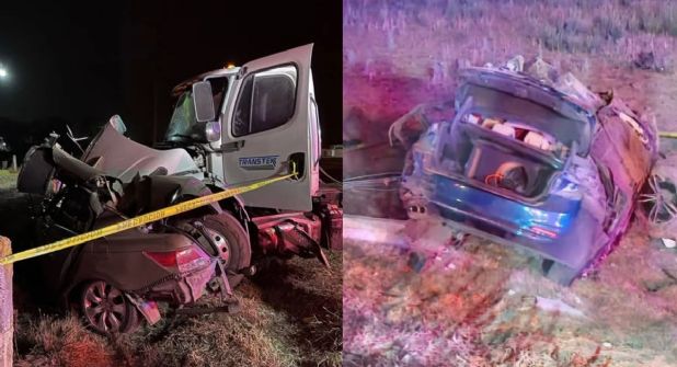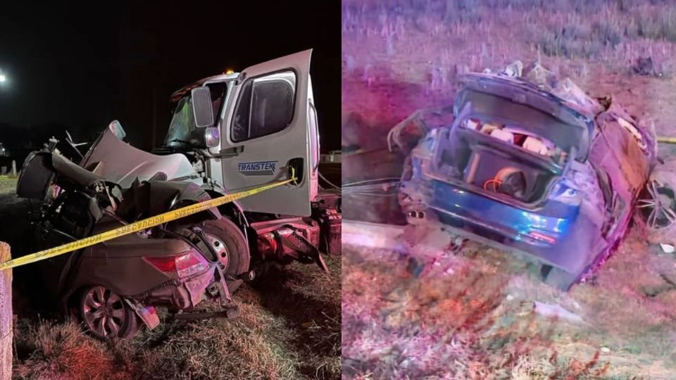 El accidente que dejó 2 muertos y cuantiosos daños materiales involucró a un tractocamión Freightliner “Madrina” y un coche particular Honda gris, el cual quedó completamente destrozado al impactar contra la pesada unidad.