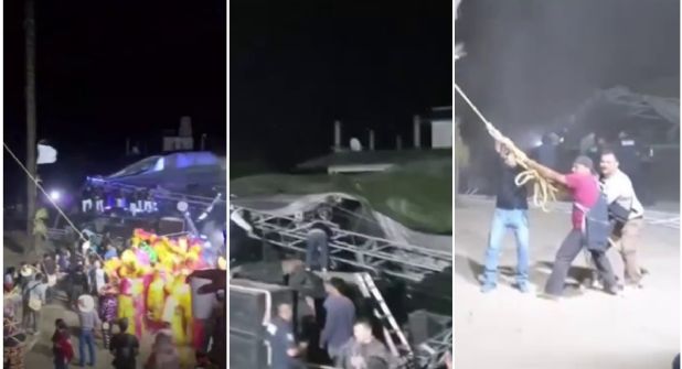 Sin embargo, las rachas comenzaron a aumentar y en un momento dado sacudieron de manera brusca el armazón de aluminio que sostenía luces y una lona negra, misma que en las imágenes fue captada casi arrancada y lo que ayudó a que el recinto móvil se sacudiera más violentamente y sin cesar.