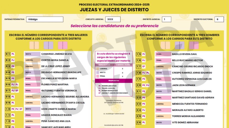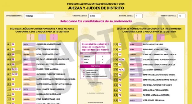 En el caso de las personas Juzgadoras de Distrito, la boleta será amarilla y en Hidalgo contendrá el nombre de 14 mujeres y 12 hombres candidatos a dicho cargo en las especialidades de derecho penal, laboral y mixto.