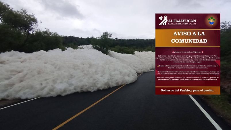 En un comunicado enviado por el gobierno municipal de Alfajaycucan informaron a la población sobre el cierre de la carretera que va de este municipio hidalguense hacia Cerro Azul, específicamente antes de llegar a la comunidad La Cañada. En la zona donde se ubica el sifón se encuentra obstruido por una acumulación de espuma proveniente del canal de aguas negras, explicaron las autoridades. Esto, por acumulación de las lluvias en las últimas horas.