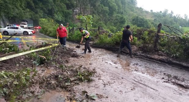 Huehuetla: Deslave sobre la carretera Huehuetla-Acuautla, obstruyendo totalmente la vialidad. Personal de Protección Civil e Infraestructura Pública trabajan en el retiro del escombro.
