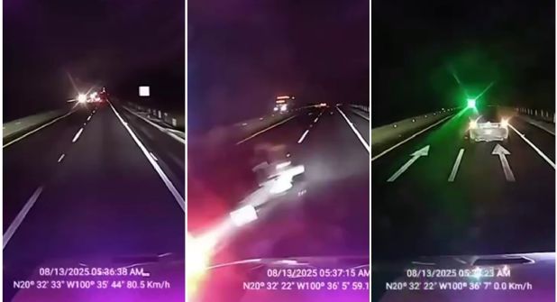 Y aunque se mantuvo transitando sin novedad por unos segundos más, al minuto 37 con 15 segundos una camioneta rebasó el tractocamión, pero no se trataba del flujo cotidiano, ya que apenas pasó la cabina quien iba al volante hizo un cerrón que frenó en seco la unidad de carga que iba a 60 kilómetros.