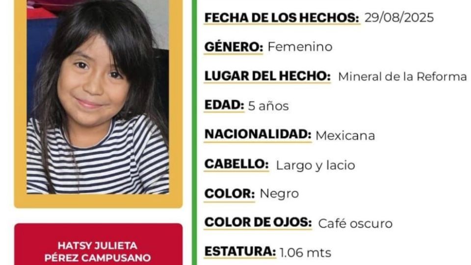 De acuerdo con la ficha búsqueda con número AAMHGO/116/2025, Julieta tiene cinco años de edad y fue vista por última vez por su madre en Mineral de la Reforma, es de nacionalidad mexicana, su cabello es largo y lacio de color negro, sus ojos son café oscuro, mide alrededor de 1.06 metros y pesa 18.3 kilogramos.
