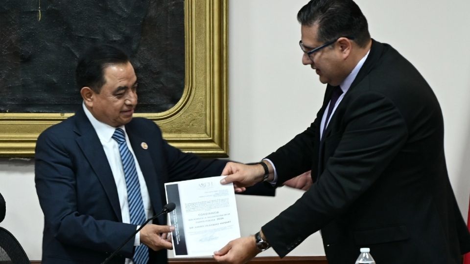 Pachuca.- El diputado Andrés Velázquez Vázquez, presidente de la Junta de Gobierno del Congreso del Estado Libre y Soberano de Hidalgo, recibió de Jorge Valverde Islas, auditor superior, la constancia de solventación de la Cuenta Pública 2024, el cual brinda certeza legal al ejercicio de rendición de cuentas del Poder Legislativo al haber cumplido con el principio de transparencia en el manejo del presupuesto público, derivado del compromiso y la labor realizada por la Dirección General de Servicios Administrativos, a cargo de la contadora Alejandra Escamilla Serrano.