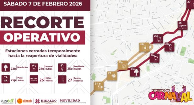 Pachuca.- Con el fin de garantizar el desarrollo seguro del desfile y las actividades culturales programadas en la capital, la Secretaría de Movilidad y Transporte estableció un cambio temporal en las rutas céntricas del Tuzobús.